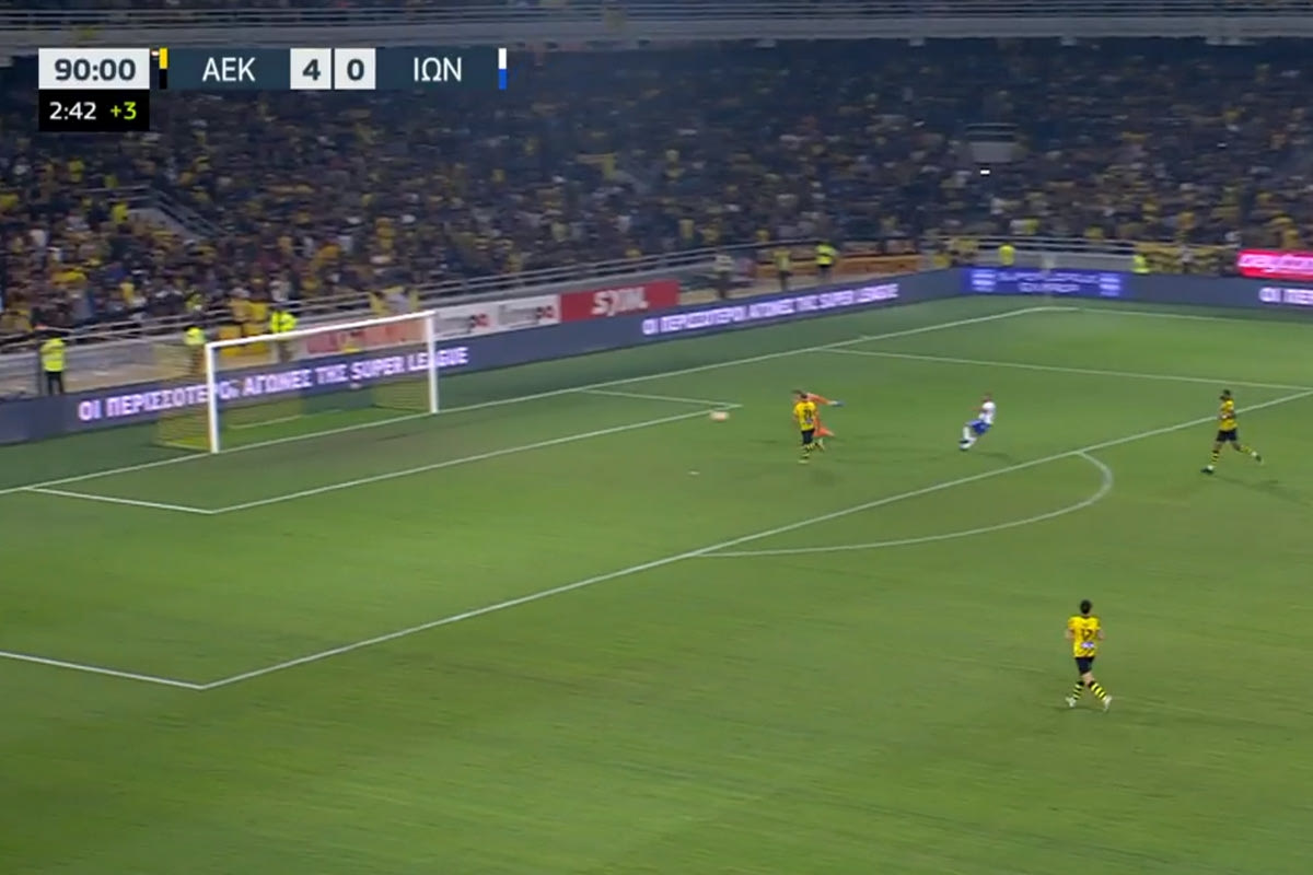 Ο Ιωνικός στο 90+3′ πέτυχε το γκολ της τιμής κόντρα στην ΑΕΚ.Ο Ελευθεριάδης έφυγε στην πλάτη της άμυνας και με πλασέ έκανε το 4-1, στο πρώτο γκολ φιλοξενούμενης ομάδας στην OPAP Arena.