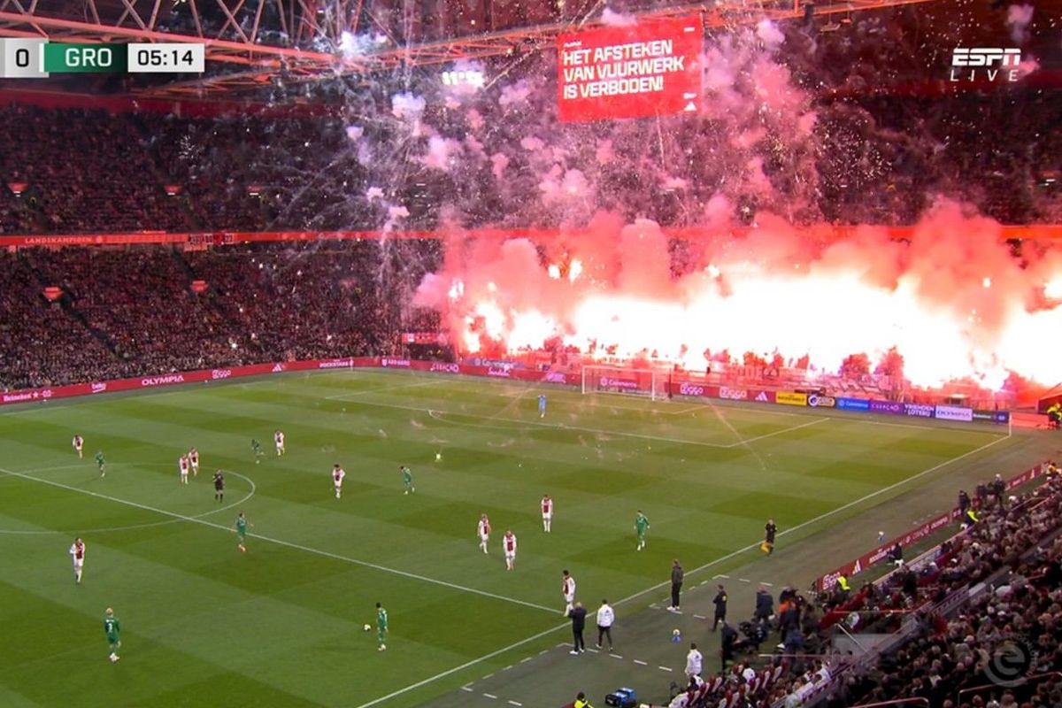 Οπαδοί του Άγιαξ άναψαν πλήθος καπνογόνων, για να τιμήσουν μνήμη συνοπαδού τους και προκάλεσαν διακοπή της αναμέτρησης με την Χρόνινχεν μόλις στο 5ο λεπτό, καθώς πέταξαν πολλά από αυτά στον αγωνιστικό χώρο.