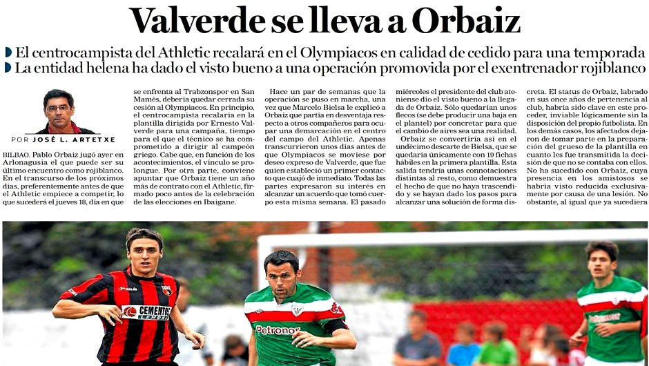Το Σάββατο 13 Αυγούστου η Deia κυκλοφόρησε με την είδηση της – σχεδόν – οριστικής συμφωνίας Ολυμπιακού και Αθλέτικ για τον δανεισμό ενός χρόνου του Πάμπλο Ορμπάιθ, επικαλούμενη αποκλειστικές πληροφορίες από τη διοίκηση της Μπιλμπάο. «Είναι προσωπική επιλογή του Ερνέστο Βαλβέρδε και η Αθλέτικ συμφώνησε για την παραχώρηση από τη στιγμή που ο Μπιέλσα δεν τον υπολογίζει για τη νέα σεζόν. Η μεταγραφή είναι σίγουρη και απομένουν απλώς ορισμένες λεπτομέρειες ώστε να ανακοινωθεί και επίσημα». Αυτά έγραφε το ρεπορτάζ των Βάσκων.