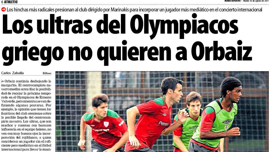 Με κεντρικό θέμα την πιθανή μεταγραφή του Ορμπάιθ στον Ολυμπιακό και τίτλο στο πρωτοσέλιδο «Το σκέφτεται», κυκλοφόρησε το κυριακάτικο φύλλο της Mundo Deportivo, συμπληρώνοντας ότι «ο παίκτης εξετάζει την πιθανότητα να καταλήξει στον Ολυμπιακό του Βαλβέρδε» και πως «οι Έλληνες έχουν τον Ορμπάιθ στην κορυφή της λίστας τους για να ενισχύσουν το κέντρο τους». Στο ρεπορτάζ γράφτηκε ότι «η διοίκηση του Ολυμπιακού θα προσπαθήσει να ικανοποιήσει την επιθυμία του Βαλβέρδε να αποκτηθεί ο Ορμπάιθ», ενώ για πρώτη φορά είχαμε την επίσημη επιβεβαίωση πως οι παίκτες της Αθλέτικ ήταν ενήμεροι για τα καθέκαστα.