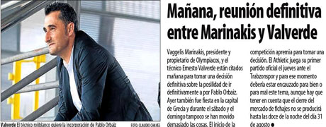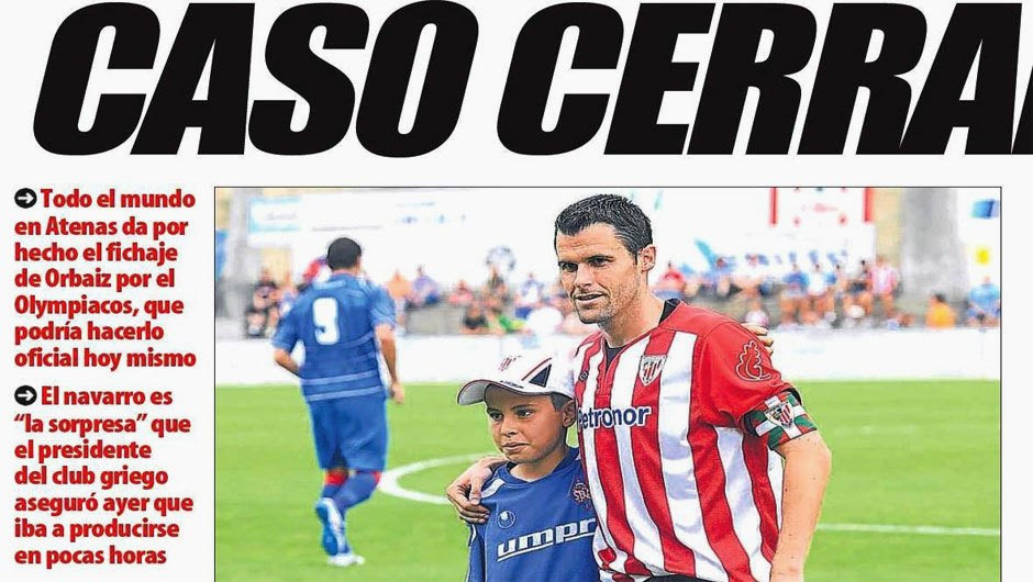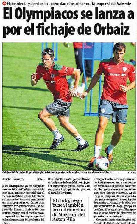 Στο κείμενο του ρεπορτάζ υπάρχει ο τίτλος «κλεισμένη υπόθεση» και στα πλαϊνά χτυπήματα: «οι πάντες στην Αθήνα θεωρούν δεδομένη τη μεταγραφή του Ορμπάιθ στον Ολυμπιακό, κάτι που είναι πιθανό να ανακοινωθεί και σήμερα» και «ο παίκτης από τη Ναβάρα είναι η έκπληξη στην οποία αναφέρθηκε χθες ο πρόεδρος του συλλόγου», ενώ στη διπλανή σελίδα οι Ισπανοί συνάδελφοι συμπληρώνουν: «η είδηση βρίσκεται σε όλα τα πρωτοσέλιδα του σημερινού αθλητικού Τύπου στην Ελλάδα».