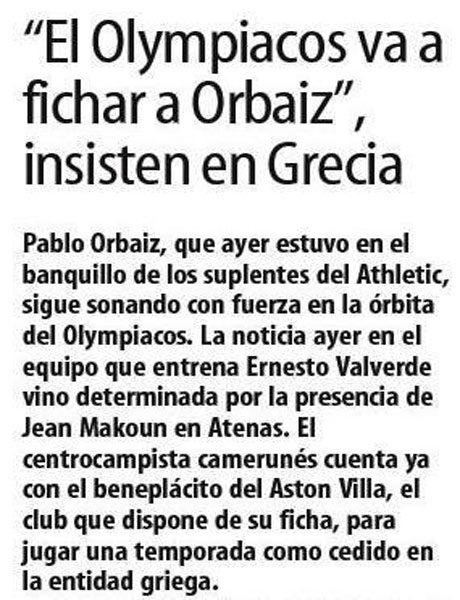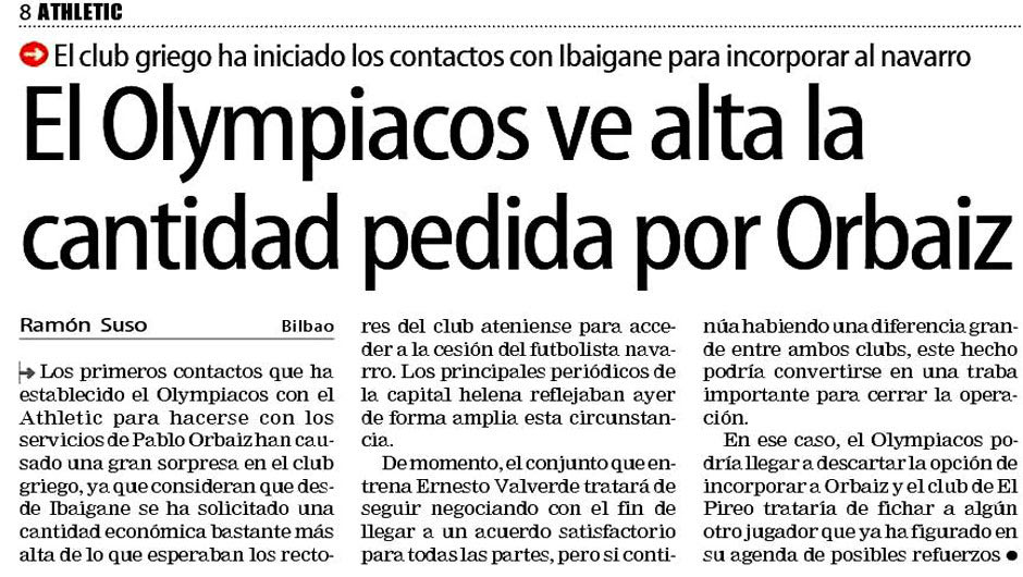 Στο κείμενο οι Βάσκοι συνάδελφοι ανέλυσαν το «πάγωμα» στις εξελίξεις για την απόκτηση του Ορμπάιθ, αποδίδοντάς το στις αντιδράσεις των οπαδών αλλά και σε σχετικά δημοσιεύματα συγκεκριμένων αθλητικών εφημερίδων, τα οποία συνέχιζαν να μη συμφωνούν με τις επιλογές της «ερυθρόλευκης» διοίκησης. «Πάντως», κατέληγε το δημοσίευμα, «η υπόθεση Ορμπάιθ δεν έχει απορριφθεί ακόμα από τον Ολυμπιακό, απλά παύει μάλλον να αποτελεί προτεραιότητα στον μεταγραφικό σχεδιασμό της ελληνικής ομάδας».