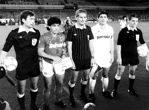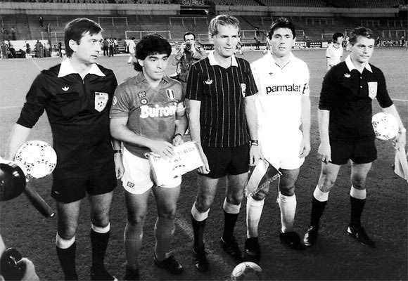 Ντιέγο Μαραντόνα και Κάρλος Σαντιγιάνα, οι δυο αρχηγοί μαζί με τον διαιτητή και τους επόπτες στην αναμνηστική φωτογραφία πριν την έναρξη του αγώνα (16/9/1987)