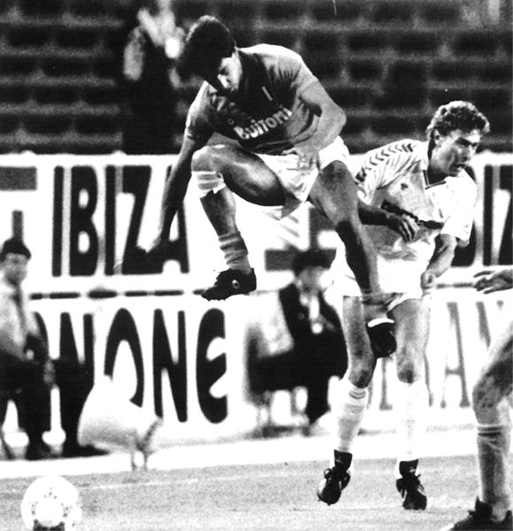 Ρεάλ Μαδρίτης – Νάπολι 2-0. Ο Μπουτραγκένιο προσπαθεί να ξεφύγει από το μαρκάρισμα του Τσίρο Φεράρα (16/9/1987)