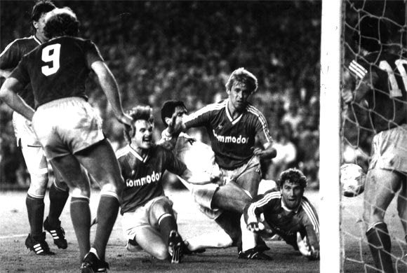 Ρεάλ Μαδρίτης – Μπάγερν 1-0. Ο Ζαν Μαρί Πφαφ που διακρίνεται στο έδαφος (δεύτερος από δεξιά), δέχτηκε πλήθος αντικειμένων από τους Ultras Sur με αποτέλεσμα να τιμωρηθεί η Ρεάλ από την UEFA (22/4/1987)