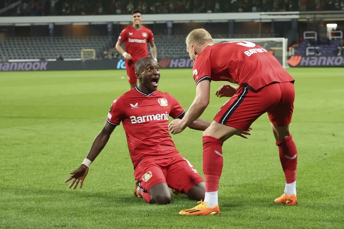 Ο Μουσά Ντιαμπό της Λεβερκούζεν πανηγυρίζει γκολ που σημείωσε κόντρα στην Ουνιόν Σεν Ζιλουάζ για τα προημιτελικά του Europa League 2022-2023 στο "Λότο Παρκ", Βρυξέλλες | Πέμπτη του Πάσχα 20 Απριλίου 2023 © 2023/Geert Vanden Wijngaert/AP IMAGES