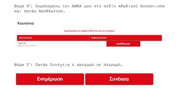Συμπληρώνω τον ΑΜΚΑ στο πεδίο “Κωδικός Κουπονιού” και πατάω Αποθήκευση. Πατάω συνέχεια και προχωρώ σε πληρωμή.