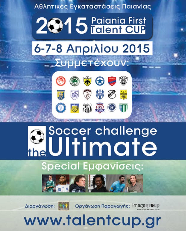 The Ultimate Soccer Challenge! 18 κορυφαίοι ποδοσφαιρικοί σύλλογοι, 1000 ανερχόμενα αστέρια του ελληνικού ποδοσφαίρου, 3 ολόκληρες ημέρες αγωνιστικού θεάματος! 6, 7 & 8 Απριλίου 2015 στις Αθλητικές Εγκαταστάσεις Παιανίας.