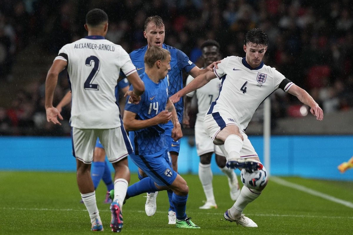 England's Declan Rice, right, is challenged by Finland's Topi Keskinen during the Group F UEFA Nations League soccer match between England and Finland at Wembley Stadium in London, Tuesday, Sept. 10, 2024. (AP Photo/Frank Augstein)