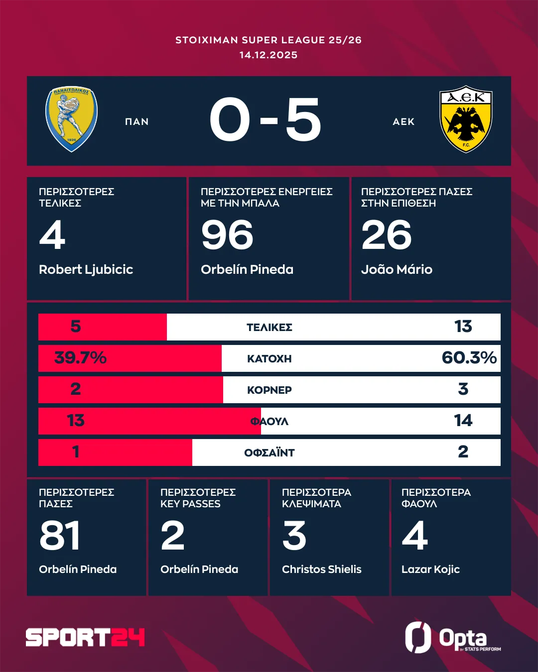 Η ΑΕΚ βρίσκεται σε τρομερή κατάσταση και το επιβεβαίωσε και στο Αγρίνιο, επικρατώντας 5-0 του Παναιτωλικού για τη 14η αγωνιστική της Stoiximan Super League. Ο Ρόμπερτ Λιούμπιτσιτς ήταν καταιγιστικός, καθώς πέτυχε δύο γκολ κι είχε μια ασίστ για τους κιτρινόμαυρους, ενώ σκόρερ χρίστηκαν και οι Πινέδα, Ζοάο Μάριο και Χρυσόπουλος.
