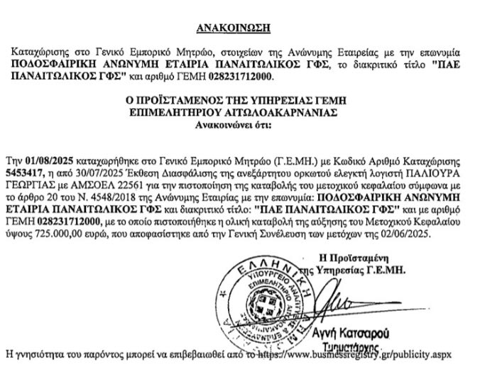 Ο ιδιοκτήτης της ΠΑΕ Παναιτωλικός, Φώτης Κωστούλας προχώρησε σε αύξηση του μετοχικού κεφαλαίου ύψους 725.000 ευρώ.