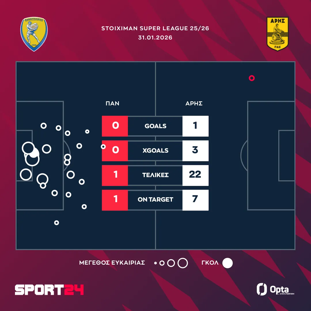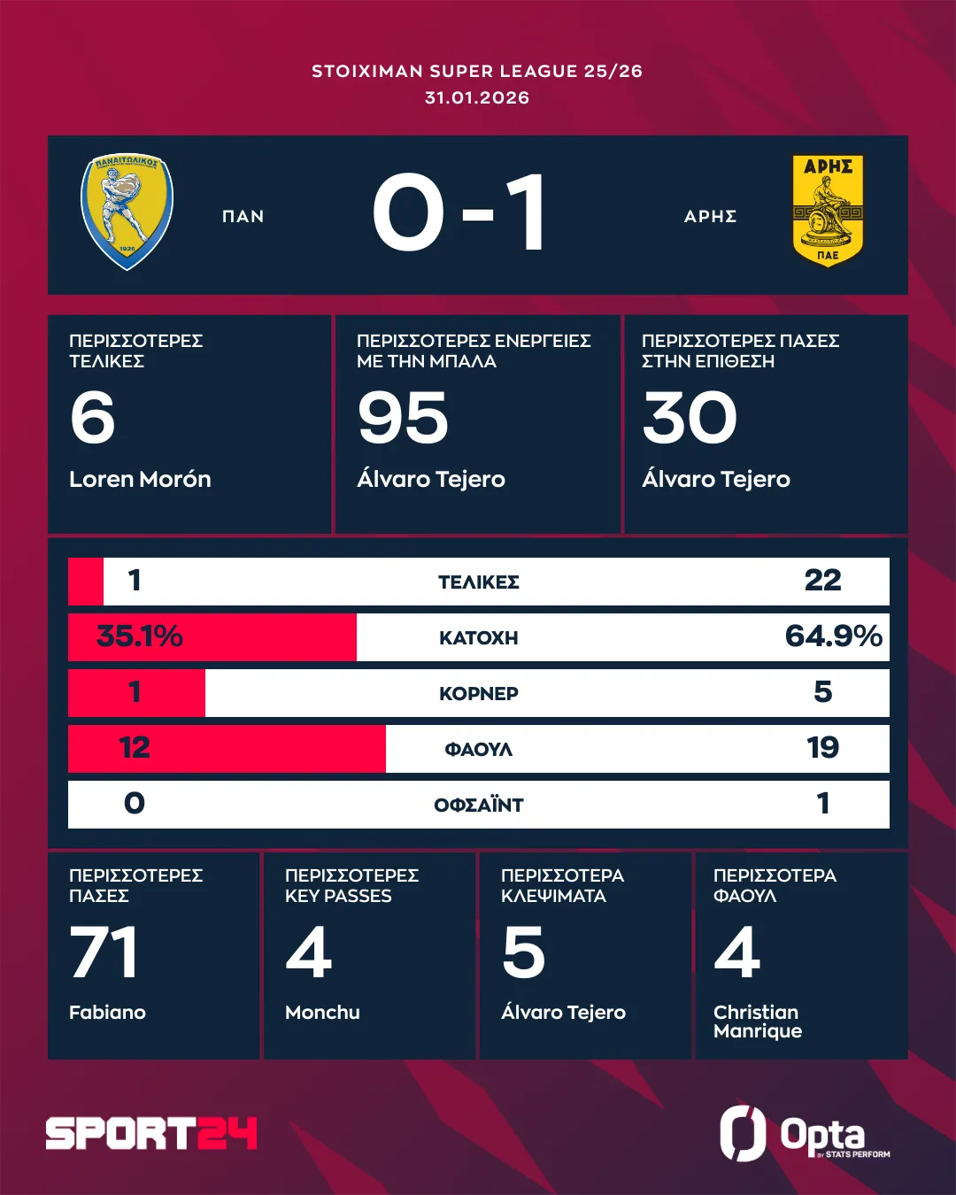Ο Άρης πέρασε νικηφόρα από το Αγρίνιο, επικρατώντας με 1-0 του Παναιτωλικού, χάρη στο γκολ του Φαμπιάνο στο 78ο λεπτό και πανηγύρισε το πρώτο του τρίποντο στο πρωτάθλημα στο 2026, πλησιάζοντας στο -1 από τον Παναθηναϊκό, στο πλαίσιο της 19ης αγωνιστικής της Stoiximan Super League.