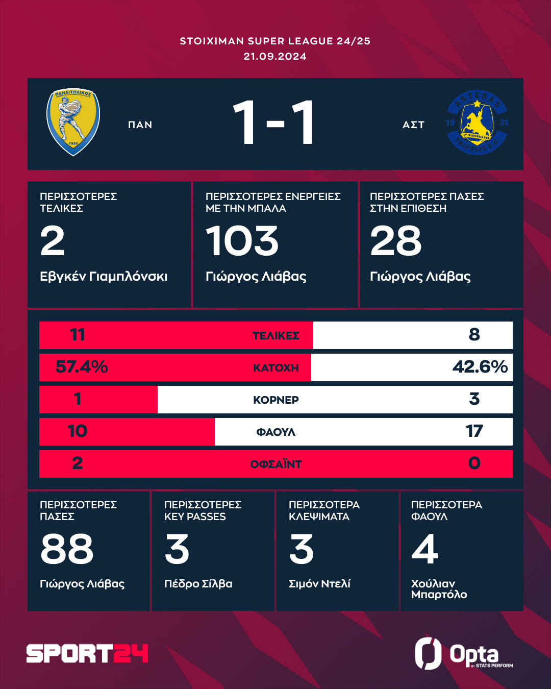 Ο Μπουζούκης είδε την κίνηση του Τορεχόν στην πλάτη της άμυνας του Αστέρα, τον τροφοδότησε με υπέροχη μακρινή μπαλιά, ο Αργεντινός σέντραρε με τη μία για τον Λομόνακο, που με ψύχραιμο πλασέ έκανε το 1-1.