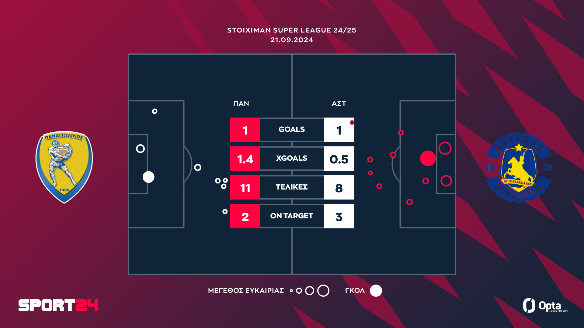 Ισόπαλο με 1-1 ολοκληρώθηκε το ματς μεταξύ του Παναιτωλικού του Αστέρα Τρίπολης AKTOR, με το οποίο έπεσε η αυλαία της πρώτης ημέρας στην πέμπτη αγωνιστική της Stoiximan Super League.