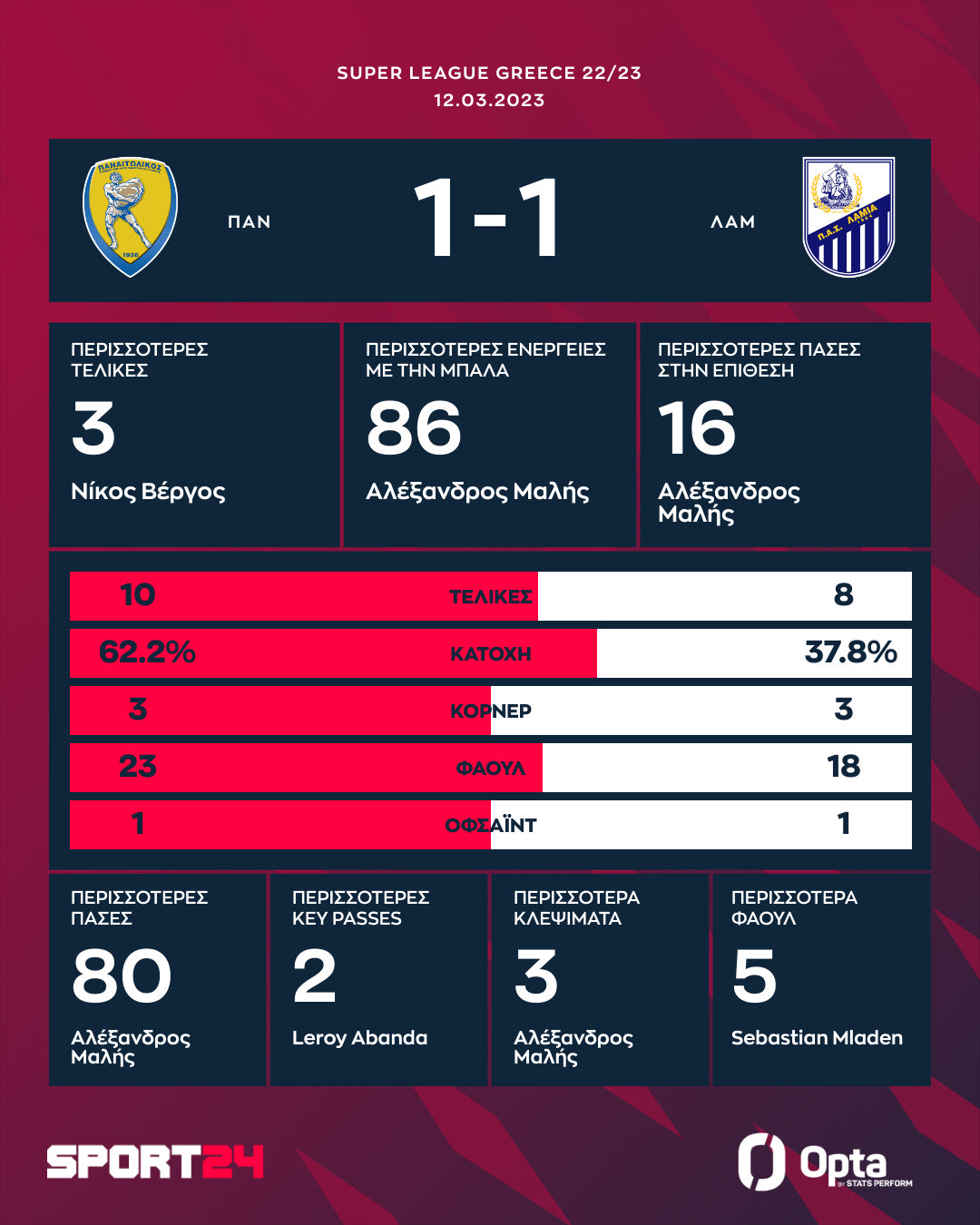 Παναιτωλικός και Λαμία αναδείχθηκαν ισόπαλοι 1-1 στο Αγρίνιο για την 26η και τελευταία αγωνιστική της κανονικής σεζόν της Stoiximan Super League.