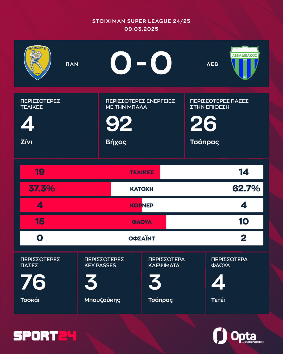 Ο Παναιτωλικός “καιγόταν”, αφού ήθελε μόνο το τρίποντο κόντρα στον Λεβαδειακό και ταυτόχρονα ο Ατρόμητος να χάσει από τον Παναθηναϊκό, προκειμένου να πάρει αυτός μία από τις θέσεις που οδηγούν στα playoffs 5-8.