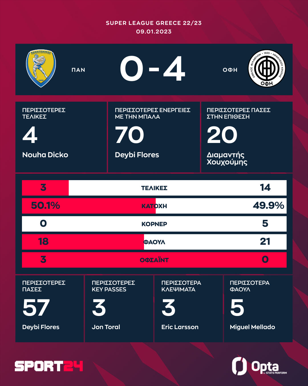 Ο κυριαρχικός ΟΦΗ πήρε το διπλό στο Αγρίνιο επικρατώντας 4-0 του Παναιτωλικού για την 17η αγωνιστική της Super League. Ο Ντίκο πέτυχε ένα εντυπωσιακό γκολ με ανάποδο ψαλίδι στο 27', ενώ σκόραρε άλλη μία φορά στο 52'. Τοράλ (73') και Τσιλιανίδης (90+4') διαμόρφωσαν το αποτέλεσμα.