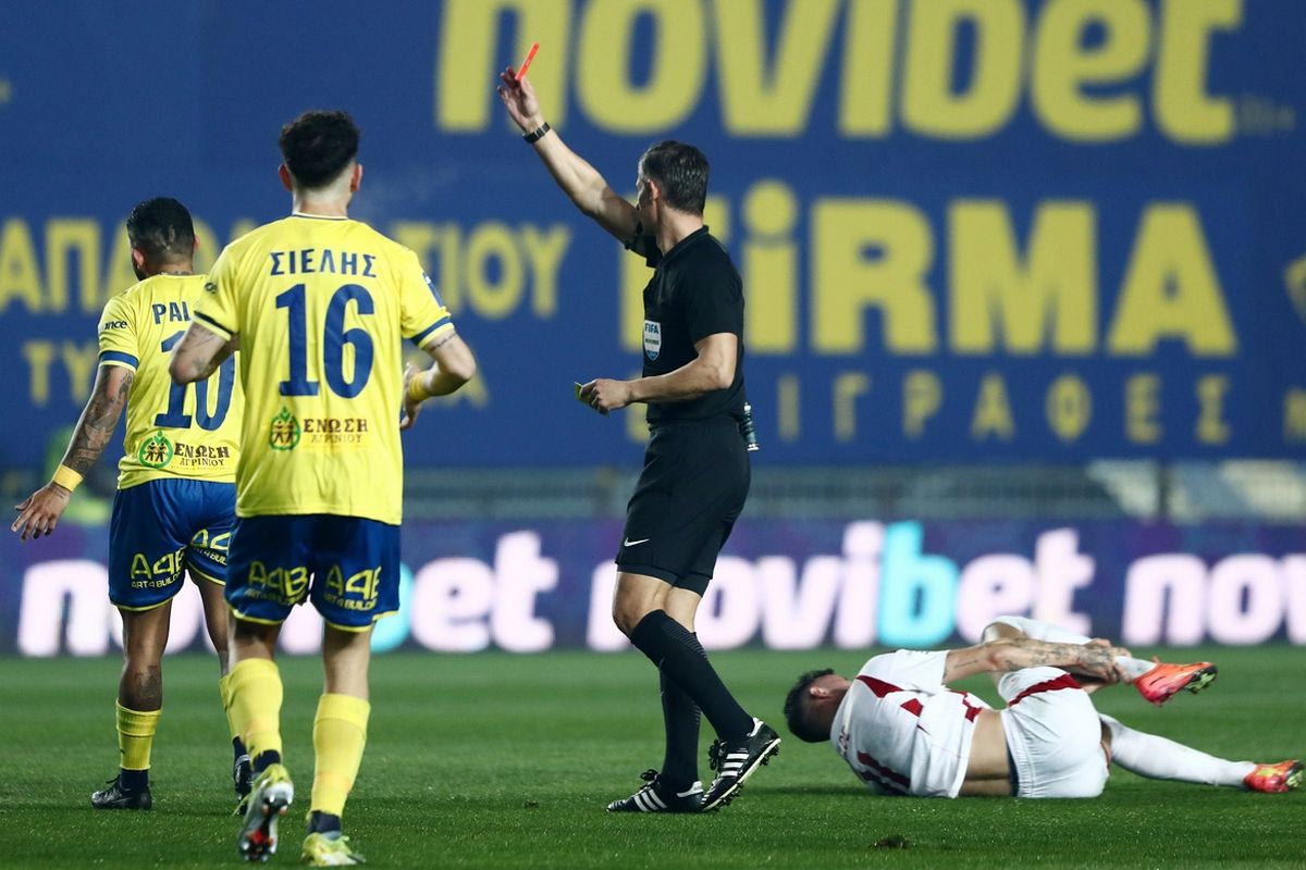 Η στιγμή που ο Σιδηρόπουλος δείχνει στον Πέρες στη δεύτερη κίτρινη κάρτα στο Παναιτωλικός - Ολυμπιακός