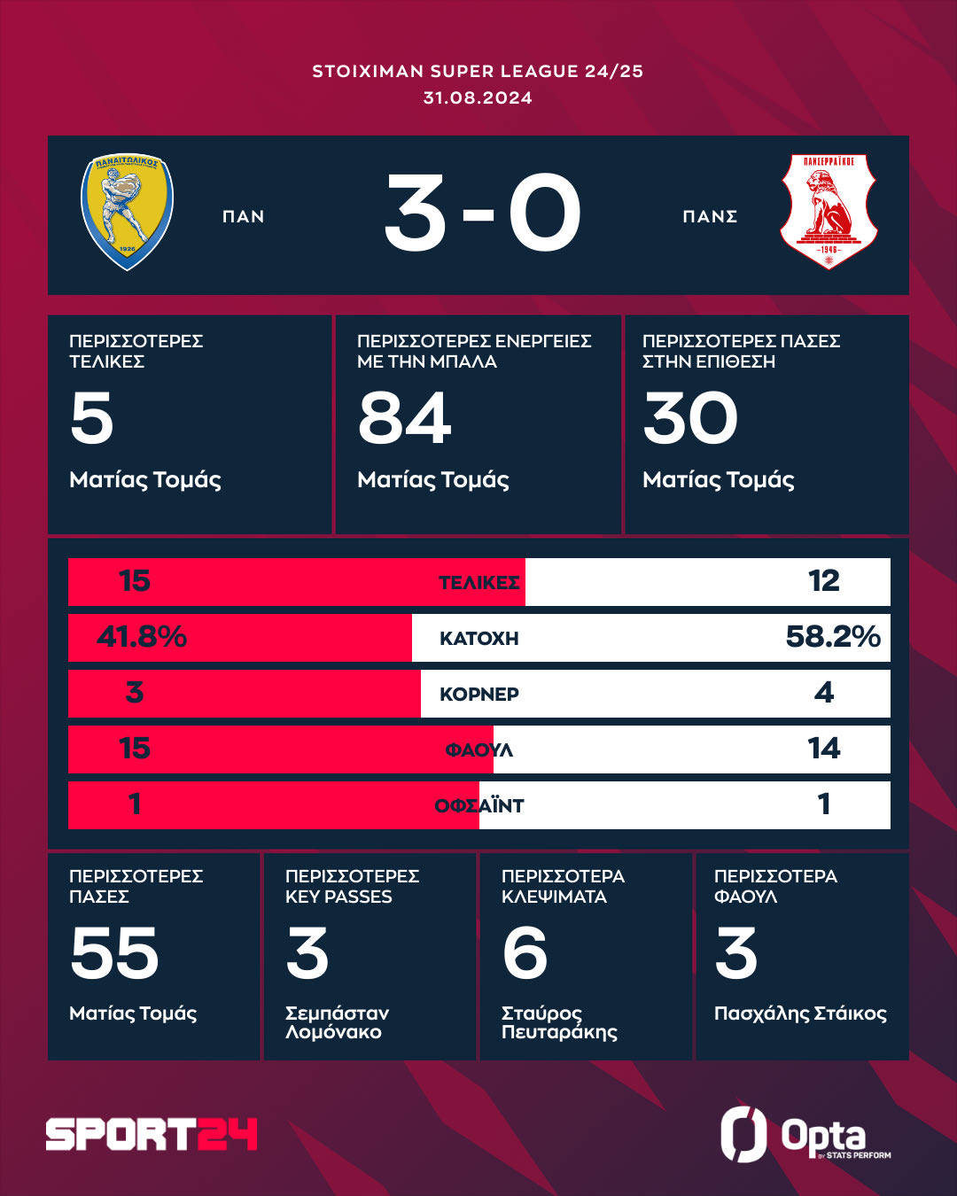 Ο Τομάς στο 60′ βρήκε με μακρινή μπαλιά πίσω από την πλάτη της άμυνας του Παναιτωλικού τον Ντέλετιτς, ο Σέρβος έκανε το κοντρόλ με το στήθος, πλάσαρε τον Τσάβες, αλλά ο Αργεντινός έκλεισε άμεσα τα πόδια του και είπε “όχι” στον εξτρέμ του Πανσερραϊκού.