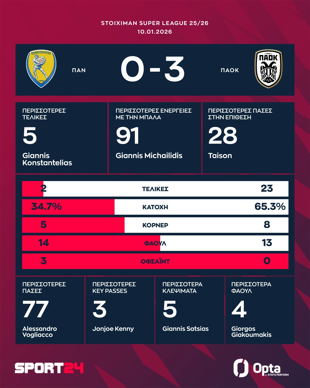 Καταιγιστικός ήταν ο ΠΑΟΚ στο Αγρίνιο, με τον Κωνσταντέλια να σκοράρει δύο φορές, τον Γιακουμάκη να συνεχίζει από εκεί που είχε σταματήσει και ο Δικέφαλος υπέταξε με 3-0 τον Παναιτωλικό. Δοκάρι είχε ο Ζαφείρης στο πρώτο ημίχρονο.