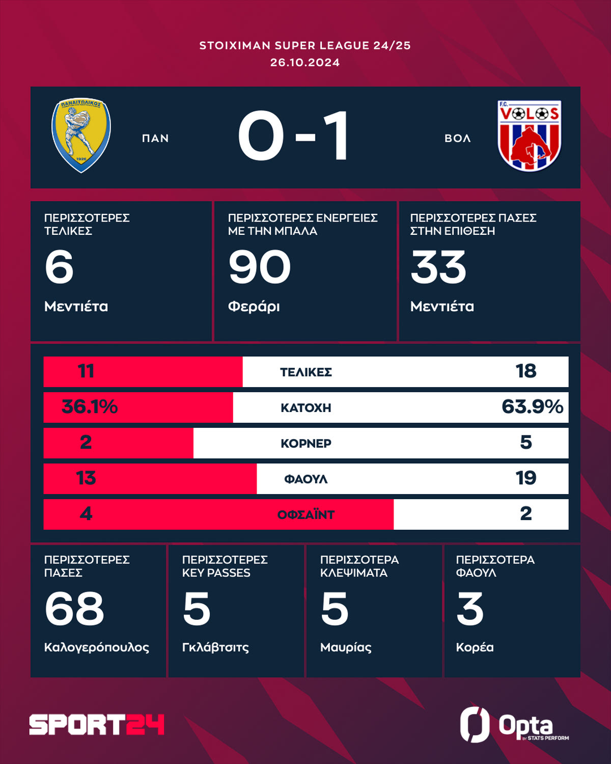 ΒΟΛΟΣ: Κόβακς, Σούντγκρεν (52′ Άλτμαν), Κορέα, Καλογερόπουλος, Φεράρι (90+13′ Σμέουλερς), Μύγας, Γκλάβτιτς, Μπερναντού (90+13′ Μίλετιτς), Κόμπα (72′ Βιγιαφάνιες), Μεντιέτα, Κόσζτα (72′ Κόντε)