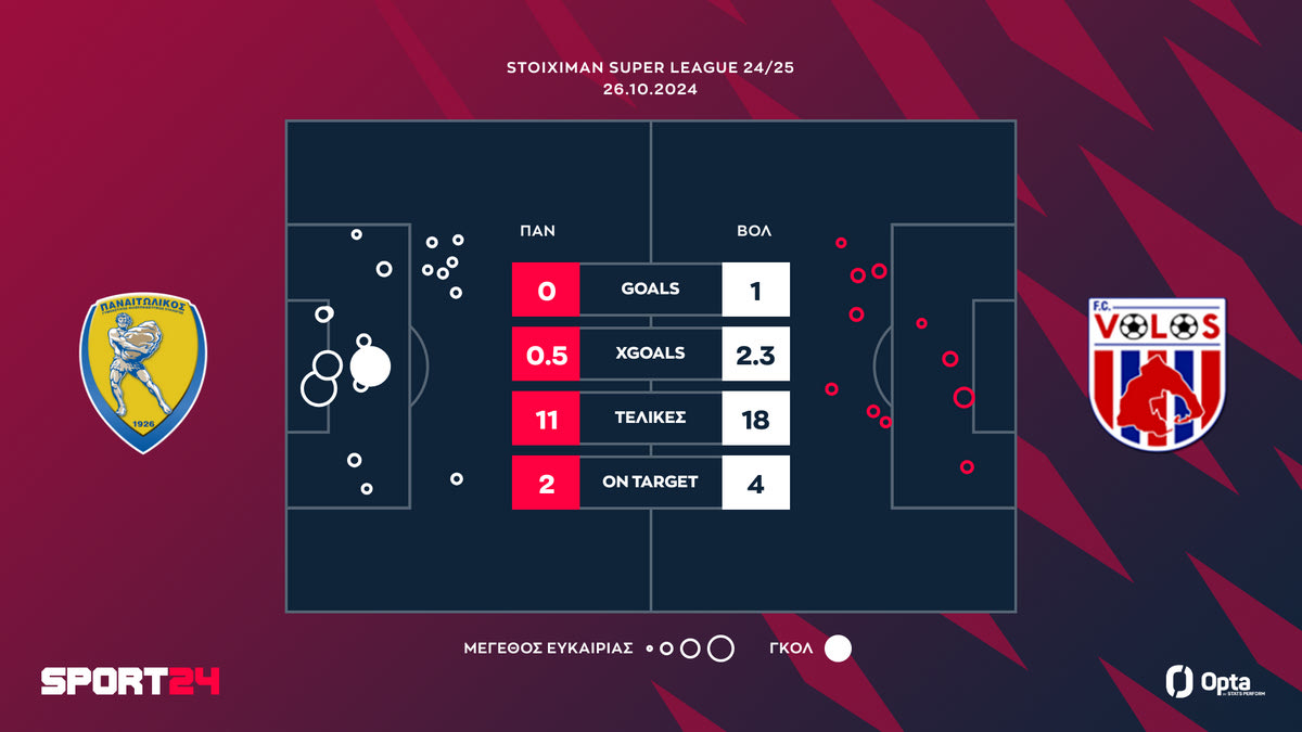 Στο 14′ οι γηπεδούχοι άγγιξαν το 1-0. Ο Μαυρίας έκανε σέντρα-σουτ από τη δεξιά πλευρά όπως επιτίθεται ο Παναιτωλικός, η μπάλα άλλαξε πορεία μετά από κόντρα παίκτη του Βόλου, ο Κόβακς ξεγελάστηκε, όμως ο Μύγας πριν αυτή περάσει τη γραμμή την έδιωξαν διατηρώντας το 0-0.