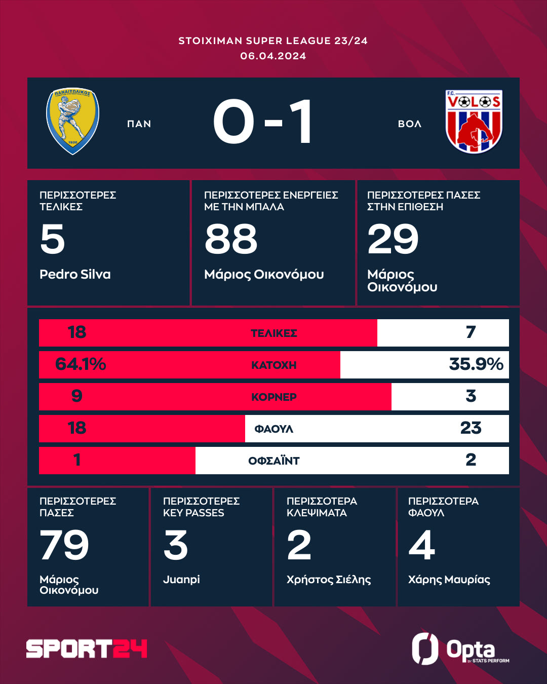 Ενώ στο 45′ ο Παναιτωλικός είχε δοκάρι. Όταν σε φάση διαρκείας μέσα στην περιοχή ο Φακούντο Πέρες έκανε την προβολή με τη μπάλα να σταματάει στο δεξί δοκάρι της εστίας του Βόλου.