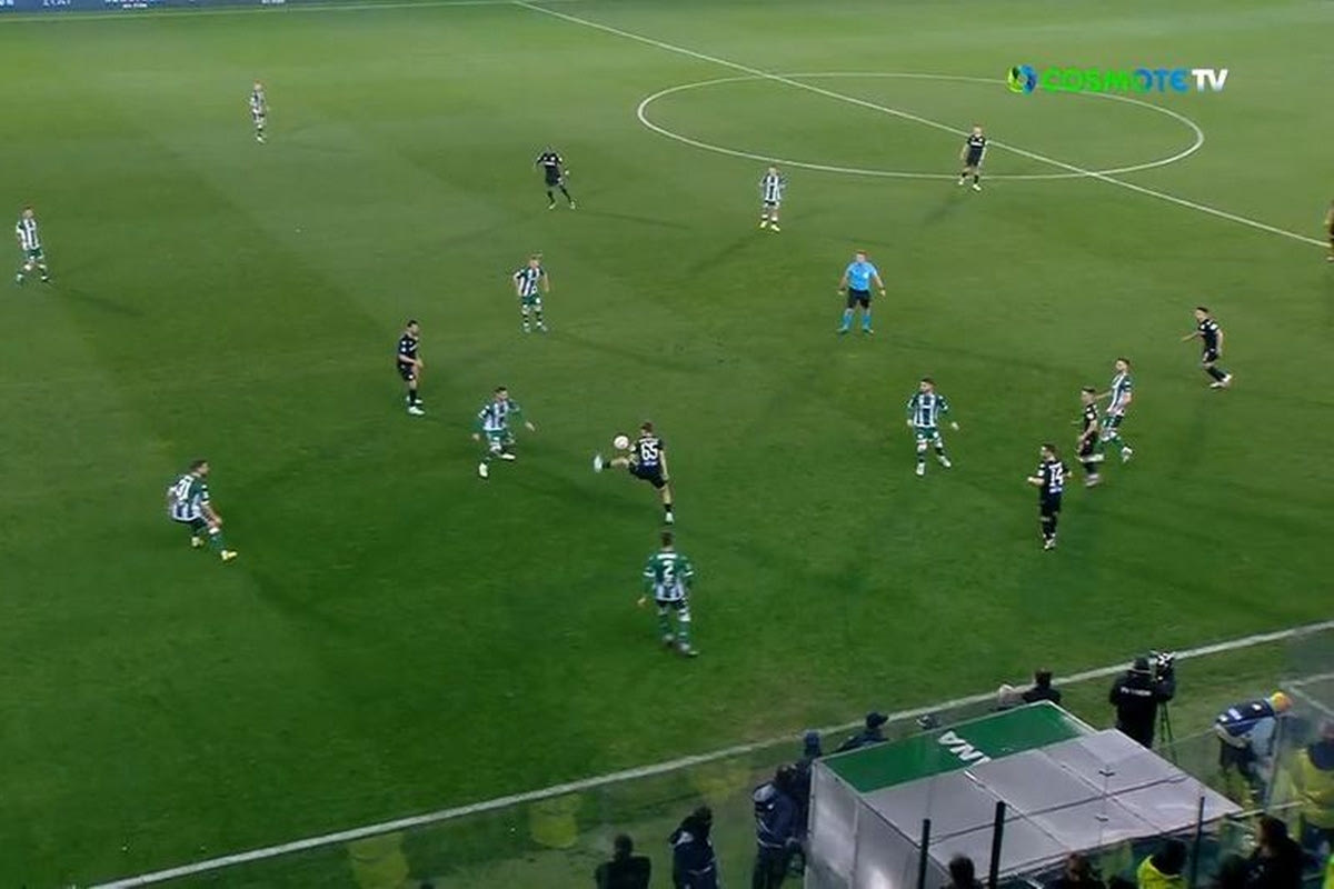 Ο Τιάγκο Ντάντας πήρε την μπάλα από πλάγιο και την έδωσε με δύναμη και ψηλά στον 19χρονο συμπαίκτη του, ο οποίος δεν έχασε την ψυχραιμία του. Αρχικά τη στόπαρε με το αριστερό και βλέποντας τον Ρουμπέν Πέρεθ έτοιμο να του… ορμήξει, τη σήκωσε πάνω από το πόδι του Ισπανού με το δεξί. Ακολούθως, την κατέβασε με το δεξί ξανά και έδωσε πάσα για να συνεχιστεί η επίθεση του ΠΑΟΚ.