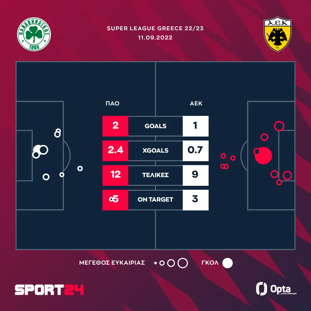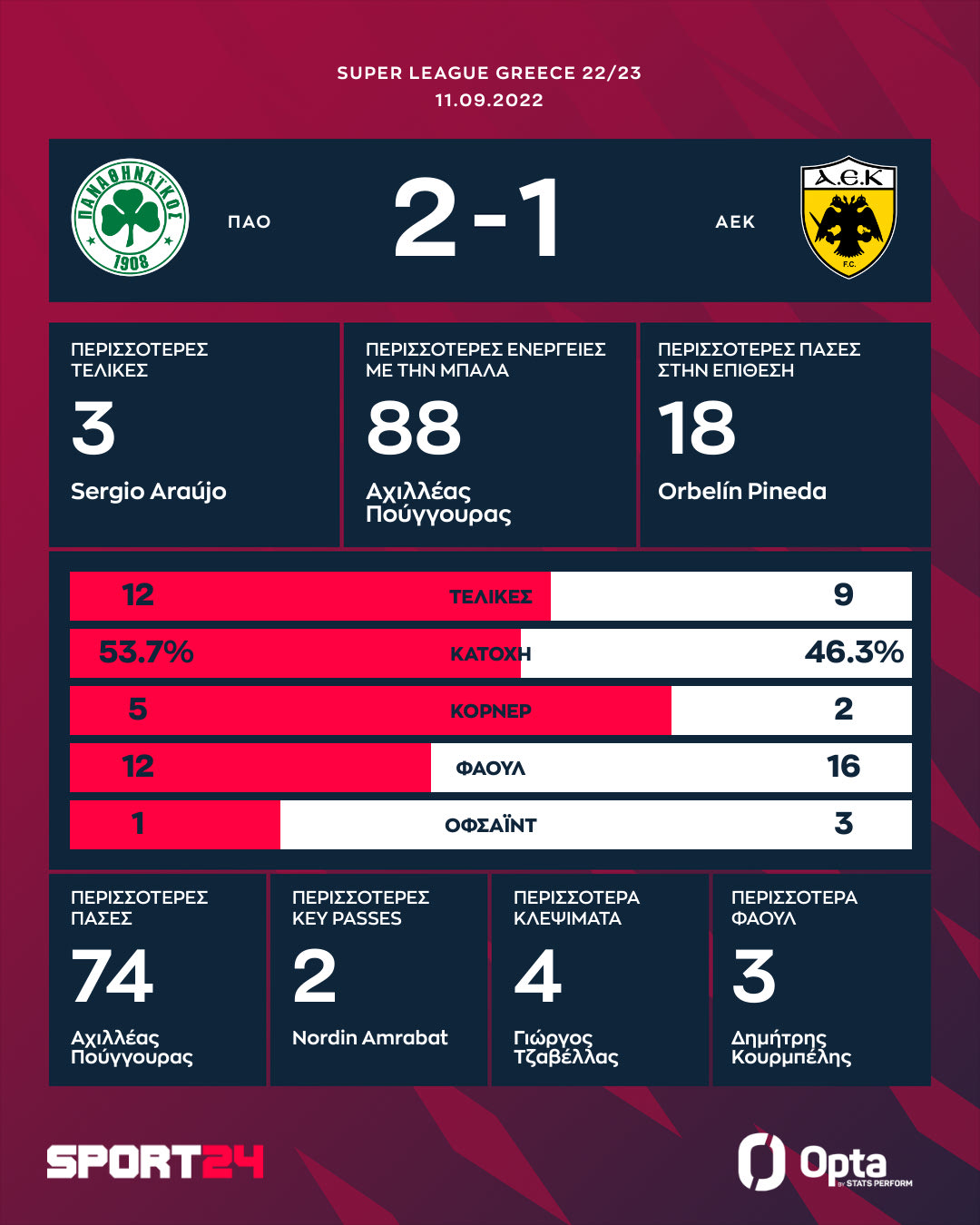 Ο Παναθηναϊκός έκανε το τέσσερα στα τέσσερα στη Super League, παίρνοντας το πρώτο ντέρμπι της χρονιάς κόντρα στην ΑΕΚ με 2-1. Ο Πινέδα άνοιξε το σκορ για την Ένωση στο 35′, ο Αϊτόρ ισοφάρισε στο 43′ με πέναλτι και ο Σπόραρ ξανά από την άσπρη βούλα έκανε την ανατροπή για το τριφύλλι. Ο Παναθηναϊκός ήταν σε γενικές γραμμές καλύτερος από την Ένωση και δικαίως έβαψε πράσινο το ντέρμπι.