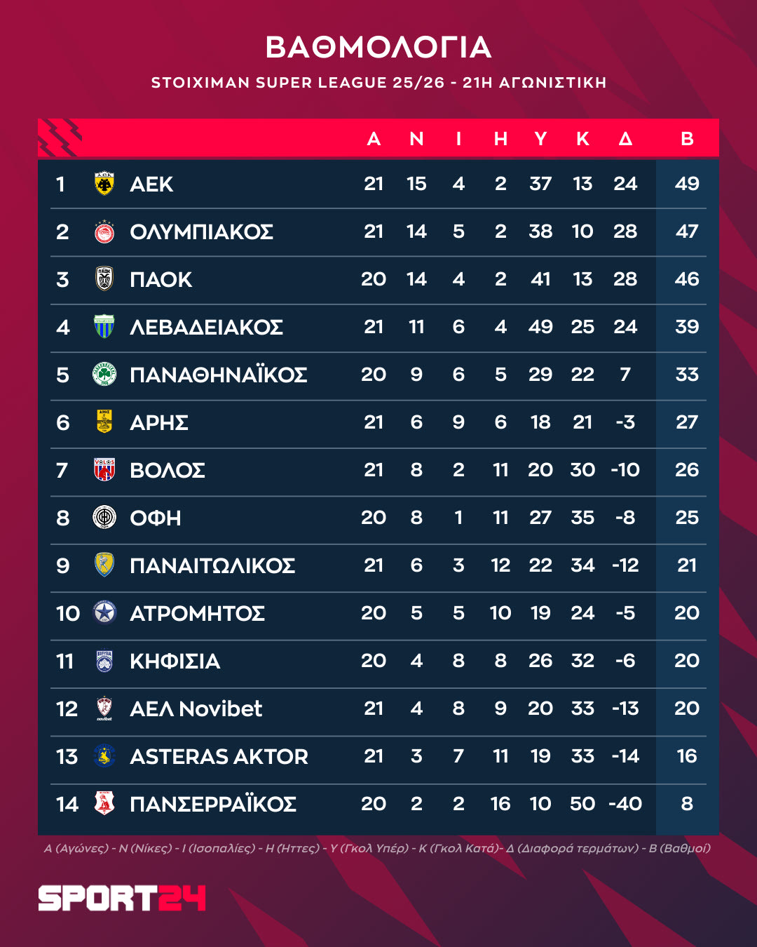 Ο Παναθηναϊκός δεν κατάφερε να κεφαλαιοποιήσει το σπουδαίο διπλό της προηγούμενης αγωνιστικής απέναντι στον Ολυμπιακό, καθώς έμεινε στο 1-1 με την ΑΕΛ Novibet για την 21η αγωνιστική της Stoiximan Super League.