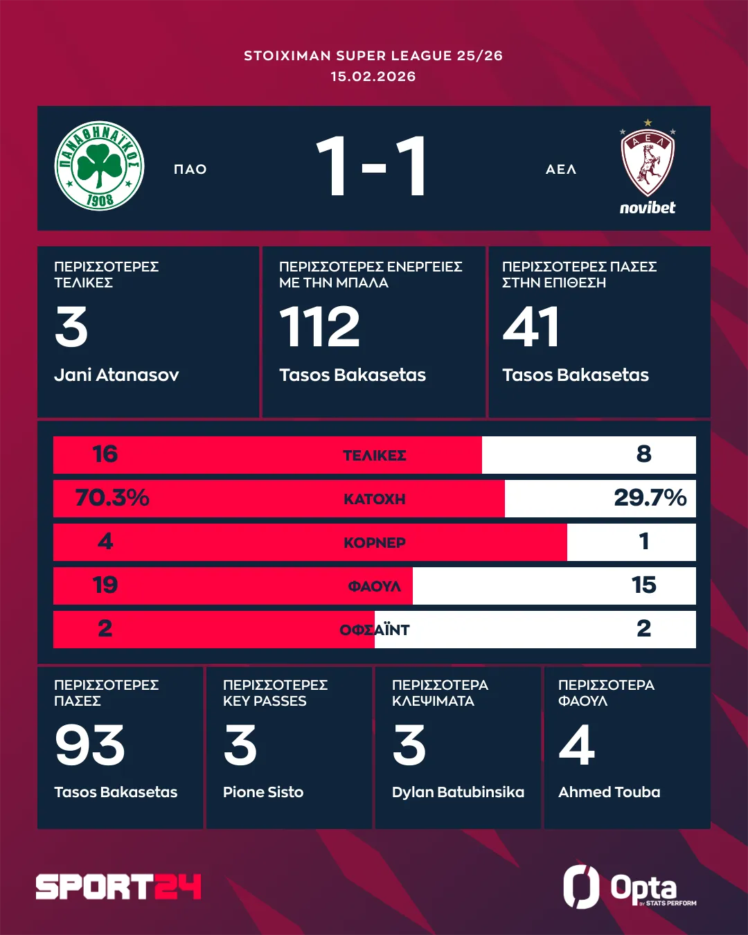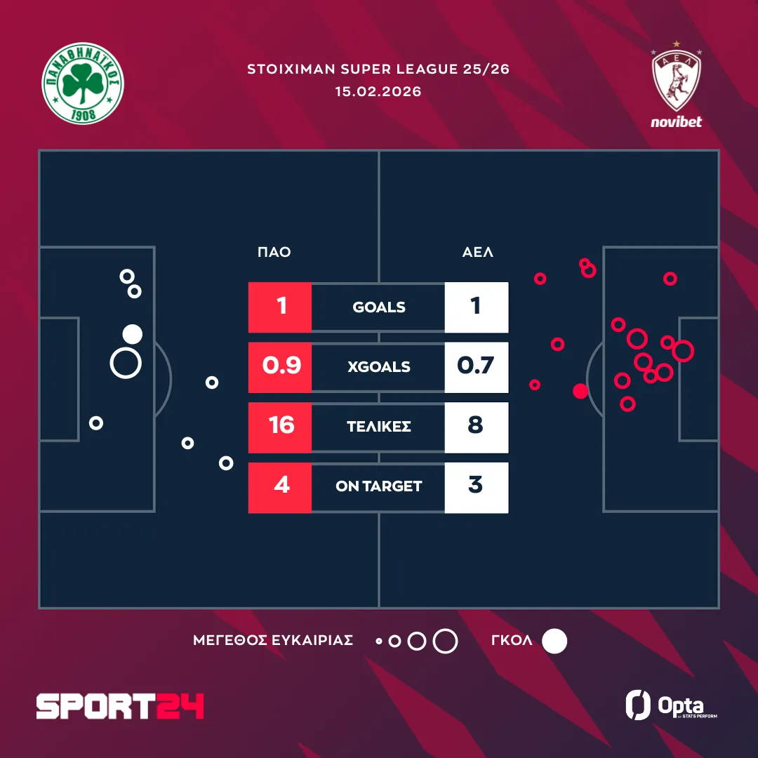 Ο Παναθηναϊκός δεν βρέθηκε σε καλή βραδιά απέναντι στην ΑΕΛ Novibet και, παρά την αντίδρασή του με το όμορφο σουτ του Μπακασέτα στο γκολ του Τούπτα, δεν κατάφερε να φτάσει στην ανατροπή, μένοντας στο 1-1 και αφήνοντας δύο πολύτιμους βαθμούς στη μάχη της τέταρτης θέσης με τον Λεβαδειακό.