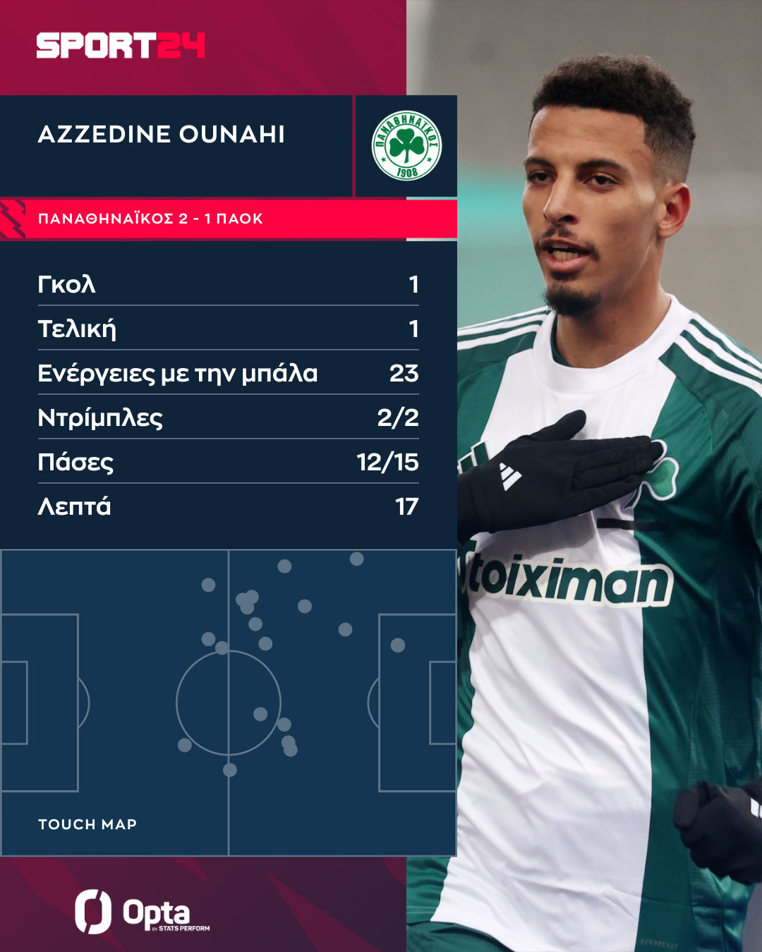 Ο Ουναχί σκόραρε στη μοναδική τελική που είχε στο παιχνίδι. Μάλιστα, ήταν και η μοναδική ενέργεια στην περιοχή, φέρνοντας εις πέρας το έργο του. Συνολικά, όσα λεπτά αγωνίστηκε είχε 23 ενέργειες με την μπάλα. Κάτι που σημαίνει πως είχε μεγάλη συμμετοχή στα λίγα λεπτά που αγωνίστηκε στο ματς του Παναθηναϊκού.
