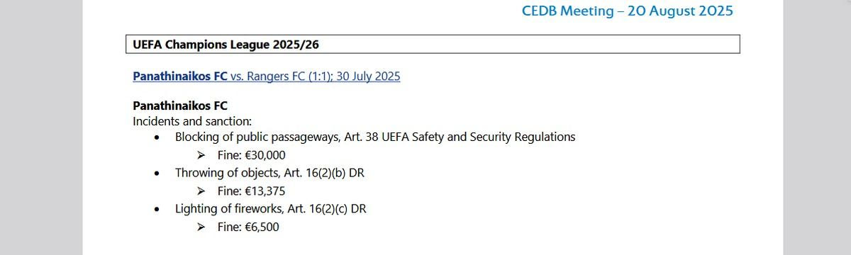 Συγκεκριμένα, για το παιχνίδι με τους Σκωτσέζους στις 30 Ιουλίου ο Παναθηναϊκός τιμωρήθηκε με 30.000 ευρώ για μπλοκαρισμένους διαδρόμους στις εξέδρες του ΟΑΚΑ, με 13.375 για ρίψη αντικειμένων καθώς και 6.500 ευρώ για άναμμα πυρσών.