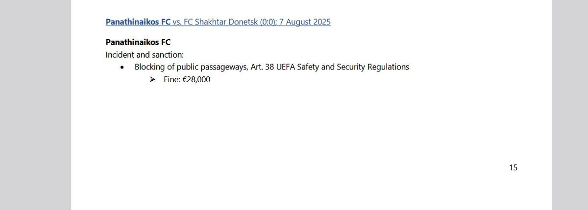 Όσον αφορά δε στην αναμέτρηση με τους Ουκρανούς στις 7 Αυγούστου, το προστιμο είναι ύψους 28.000 ευρώ λόγω μπλοκαρισμένων διαδρόμων και διόδων στις εξέδρες.