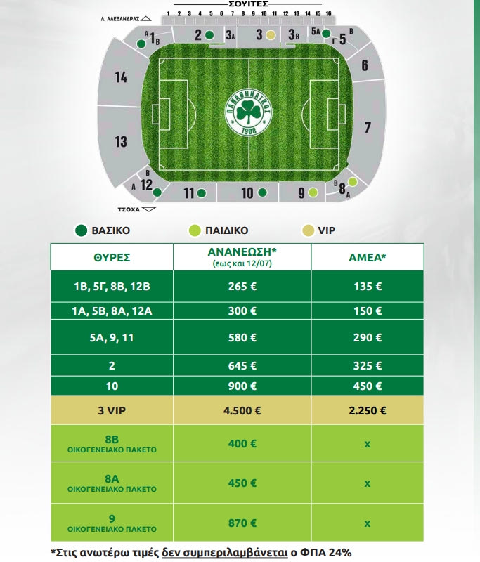 Εξαίρεση αποτελούν οι κάτοχοι εισιτηριών διαρκείας VIP, οι οποίοι με το εισιτήριό τους θα μπορούν να παρακολουθήσουν όλους τους εντός έδρας αγώνες του Παναθηναϊκού σε οποιαδήποτε διοργάνωση, καθώς και σε όλες τις φάσεις των ευρωπαϊκών κυπέλλων. Σε περίπτωση αλλαγής έδρας σε ευρωπαϊκούς αγώνες, θα υπάρξει αντιστοίχιση στις θύρες της νέας έδρας.