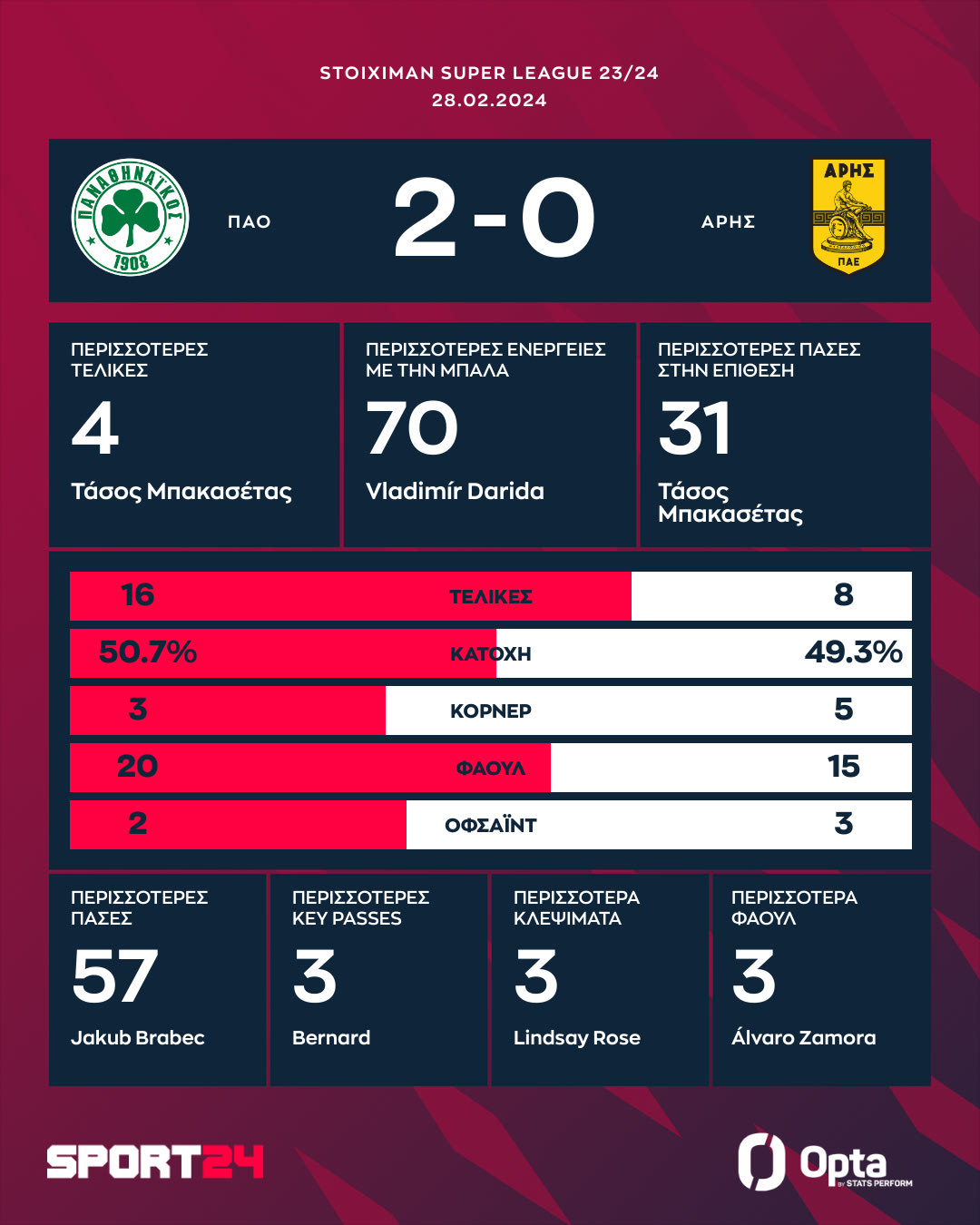 ΠΑΝΑΘΗΝΑΪΚΟΣ: Ντραγκόβσκι, Κώτσιρας, Ούγκο, Ακαϊντίν, Μλαντένοβιτς, Ζέκα, Τσέριν (80′ Αράο), Μπακασέτας (89′ Βιλένα), Παλάσιος (80′ Μαντσίνι), Μπερνάρ (90+2′ Λημνιός), Ιωαννίδης (80′ Σπόραρ).