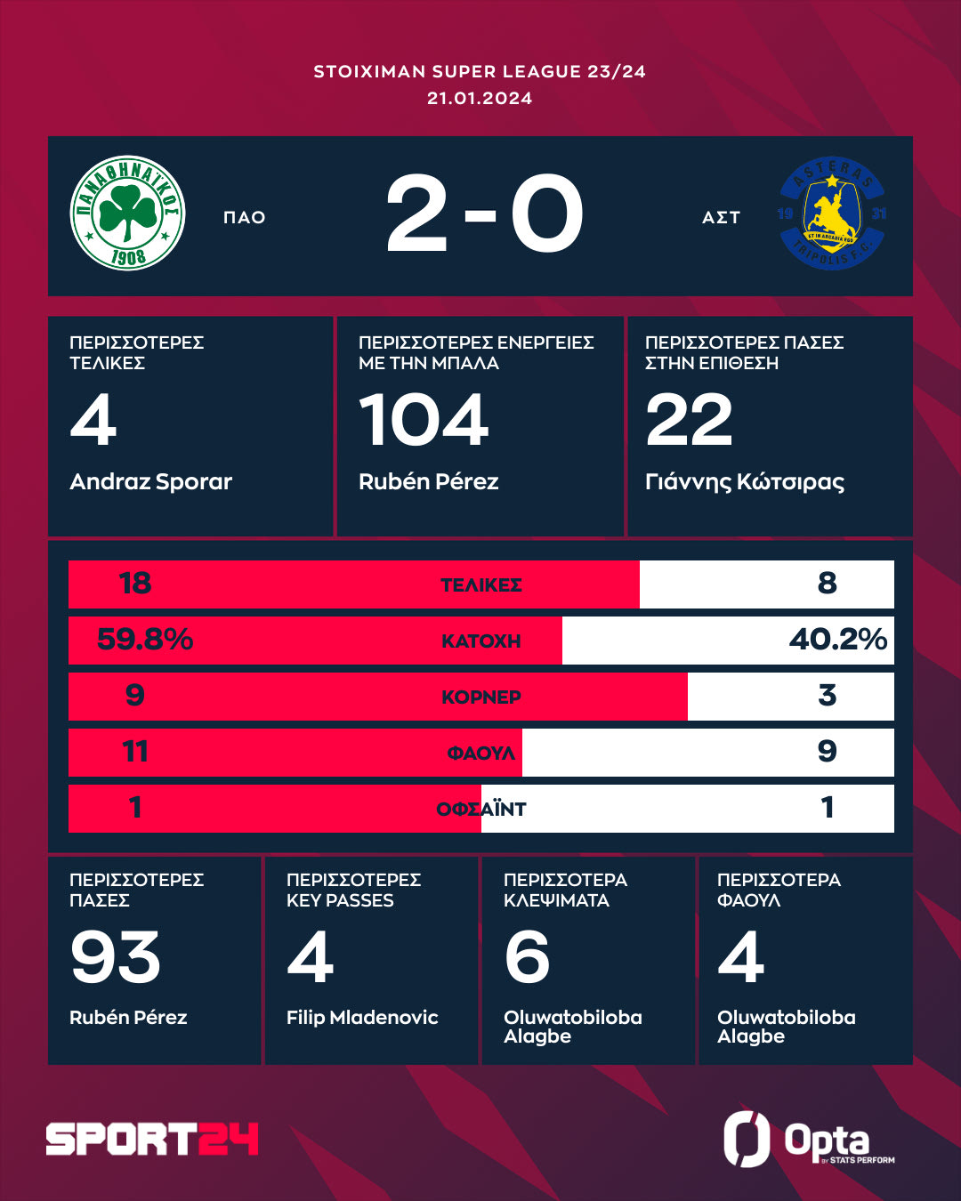 Ο Αστέρας σε αντίθεση με το πρώτο 45λεπτο δεν κατάφερε να βρει τελική προς την εστία του Παναθηναϊκού, ούτε καν να πατήσει περιοχή. Αντίθετα το τριφύλλι έφτασε και σε ένα δεύτερο γκολ και “κλείδωσε” το τρίποντο.