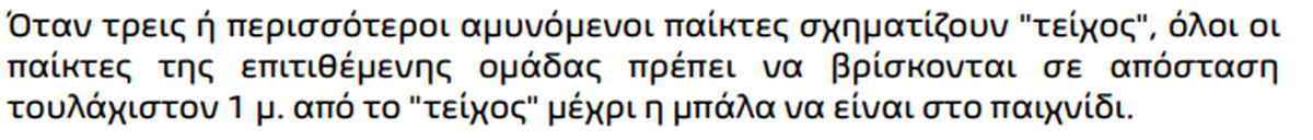 Σύμφωνα με τη δεύτερη παράγραφο στον κανονισμό 13 στο εγχειρίδιο διαιτησίας, “όταν υπάρχουν τρεις ή παραπάνω παίκτες μίας ομάδας στο τείχος για την εκτέλεση φάουλ, τότε ποδοσφαιριστής από την αντίπαλη ομάδα θα πρέπει να απέχει τουλάχιστον ένα μέτρο από αυτό”.