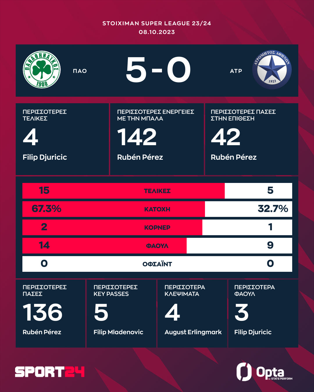Ο Παναθηναϊκός επικράτησε με σχετική ευκολγία του Ατρόμητου με 5-0 με τον Φίλιπ Τζούριτσιτς να πετυχαίνει δύο τέρματα και να έχει μια ασίστ ενώ εξαιρετικός ήταν και ο Παλάσιος με γκολ και ασίστ. Στη δεύτερη θέση σκαρφάλωσαν πλέον οι πράσινοι, τρεις βαθμούς πίσω από τον Ολυμπιακό.
