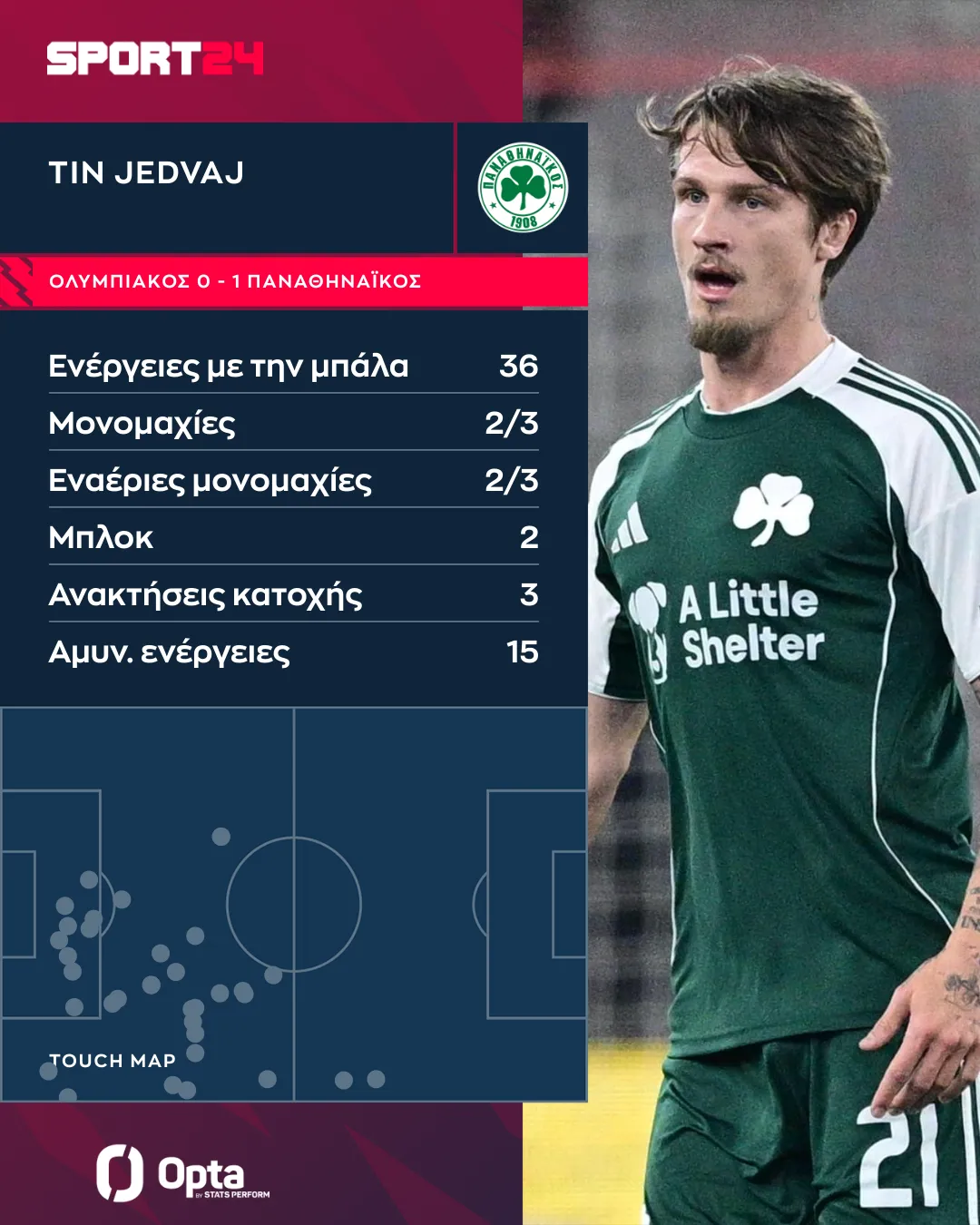 Στις μονομαχίες τα πήγε καλύτερα (9/17 συνολικά), όμως η άμυνα του Παναθηναϊκού τον κράτησε μακριά από τον χώρο δράσης του, παρά τις 55 επαφές του με την μπάλα και τις 14 μέσα στην περιοχή των ερυθρόλευκων.