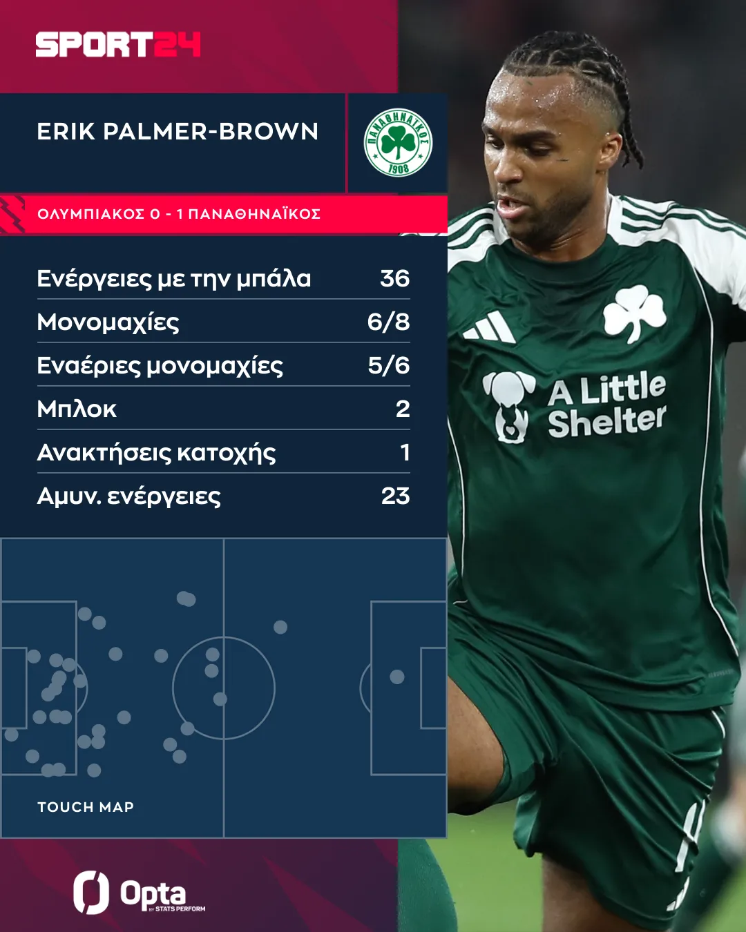 Ο παίκτης πάντως, που ξεχώρισε λίγο παραπάνω στην έδρα του αιώνιου αντιπάλου ήταν ο Έρικ Πάλμερ-Μπράουν. Ένας ποδοσφαιριστής που πέρασε πολλά, αλλά από τη στιγμή που άφησε πίσω του τους τραυματισμούς, έχει εξελιχθεί σε σημείο αναφοράς στην άμυνα του Παναθηναϊκού.