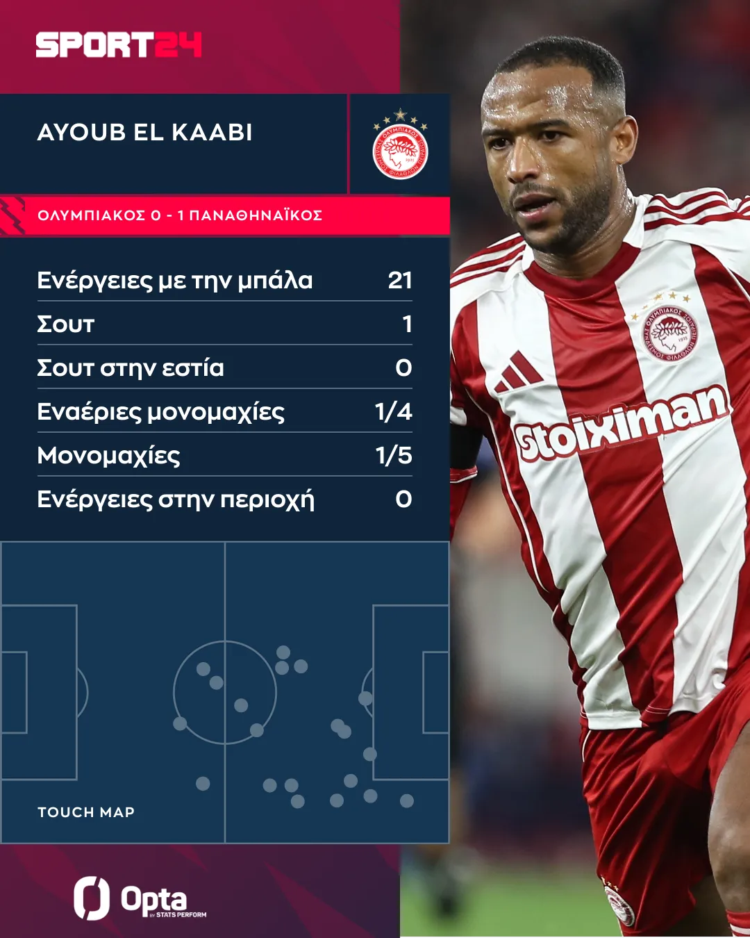 Ο Αγιούμπ Ελ Κααμπί, παίκτης που δεν χρειάζεται πολλές επαφές για να σκοράρει, περιορίστηκε μόλις σε ένα σουτ εκτός περιοχής στο 61ο λεπτό, με αξία 0.13 xGoals. Στα 64 λεπτά που αγωνίστηκε, είχε 21 επαφές, έχασε επτά φορές την κατοχή και κέρδισε μόλις μία μονομαχία από τις πέντε που επιχείρησε.