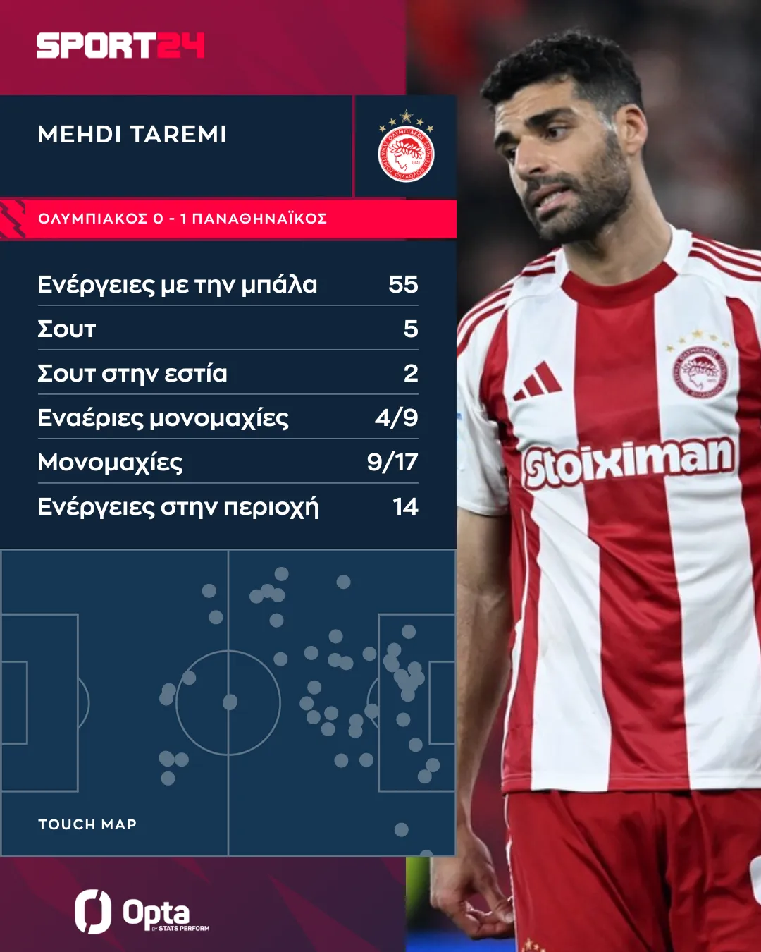 Νούμερα που μαρτυρούν πόσο φτωχή ήταν η επιρροή του Μαροκινού αρχισκόρερ στο παιχνίδι του Ολυμπιακού, επιβεβαιώνοντας ότι ο φορ των ερυθρόλευκων δεν έχει επιστρέψει ίδιος μετά την επίπονη διαδικασία του Copa Africa.