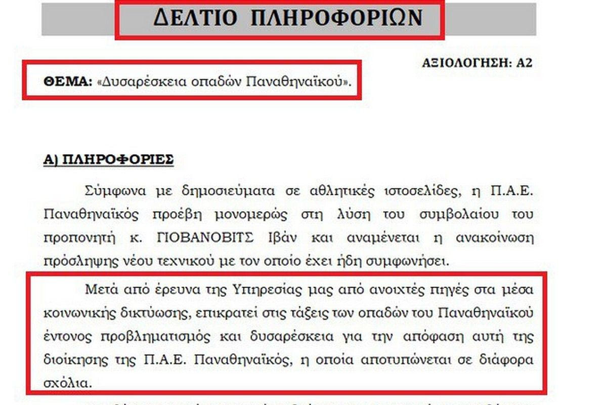 “Σύμφωνα με δημοσιεύματα σε αθλητικές ιστοσελίδες, η Π.Α.Ε. Παναθηναϊκός προέβη μονομερώς στη λύση του συμβολαίου του προπονητή κ. Γιοβάνοβιτς Ιβάν και αναμένεται η ανακοίνωση πρόσληψης νέου τεχνικού με τον οποίο έχει ήδη συμφωνήσει.