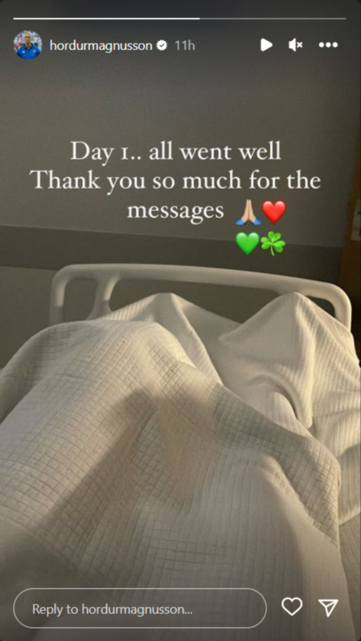 Ο Ισλανδός στόπερ ανήρτησε στο Instagram μία φωτογραφία μέσα από το νοσοκομείο προκειμένου να ενημερώσει πως όλα πήγαν καλά στο χειρουργείο, καθώς και να ευχαριστήσει τον κόσμο για όλα τα μηνύματα αγάπης και στήριξης που του έστειλαν.
