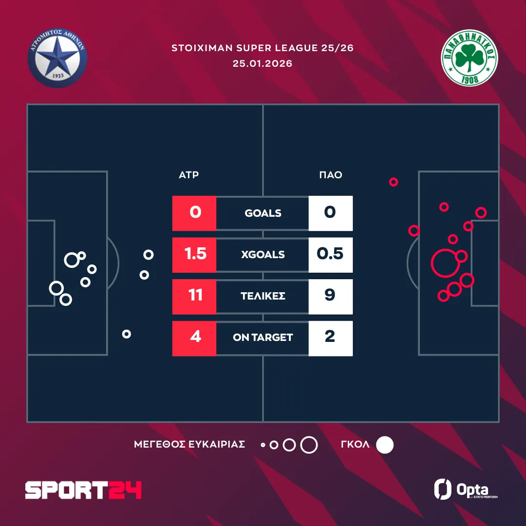 Ο Παναθηναϊκός έδειχνε, δίχως καμία διάθεση υπερβολής, ανήμπορος να απειλήσει τον Ατρόμητο και το γράφημα της Opta/Stats Perform με τις τελικές των δύο ομάδων αποδεικνύει την πικρή αλήθεια των πράσινων.