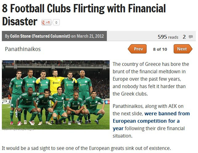 “Your team could be next”, αναφέρει το δημοσίευμα (“η ομάδα σου μπορεί να είναι η επόμενη”) και στη συνέχεια παρουσιάζει 8 προβληματικούς οικονομικά συλλόγους. Ανάμεσά τους ο Παναθηναϊκός και η ΑΕΚ!