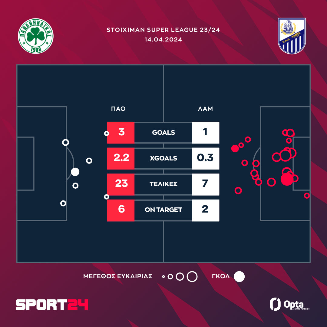Στο 42′ το τριφύλλι απείλησε ξανά. Σε κάθετη πάσα προς τον Σπόραρ, ο Σλοβένος μπήκε από τα δεξιά, πέρασε τον Κοσέλεφ αλλά από πλάγια θέση έκανε το σουτ με τη μπάλα να σταματάει στο αριστερό δοκάρι του γκολκίπερ της Λαμίας.
