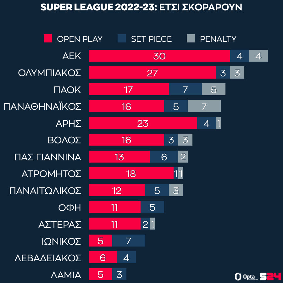 Δεν είναι μόνο ότι ο Παναθηναϊκός είναι 4ος στο σύνολο, πίσω από ΑΕΚ, Ολυμπιακό και ΠΑΟΚ. Είναι κυρίως αυτό που συμβαίνει στις κόκκινες μπάρες, που δείχνουν τα γκολ που έχουν βρει οι ομάδες στο open play, στην κανονική ροή του αγώνα.