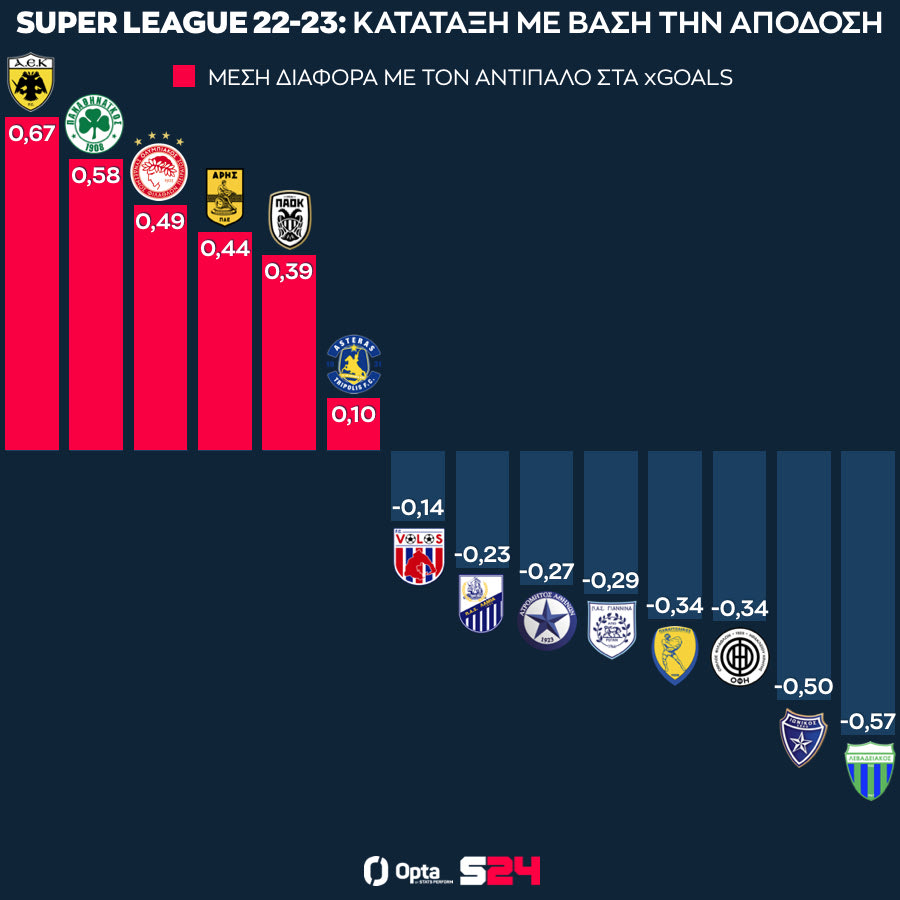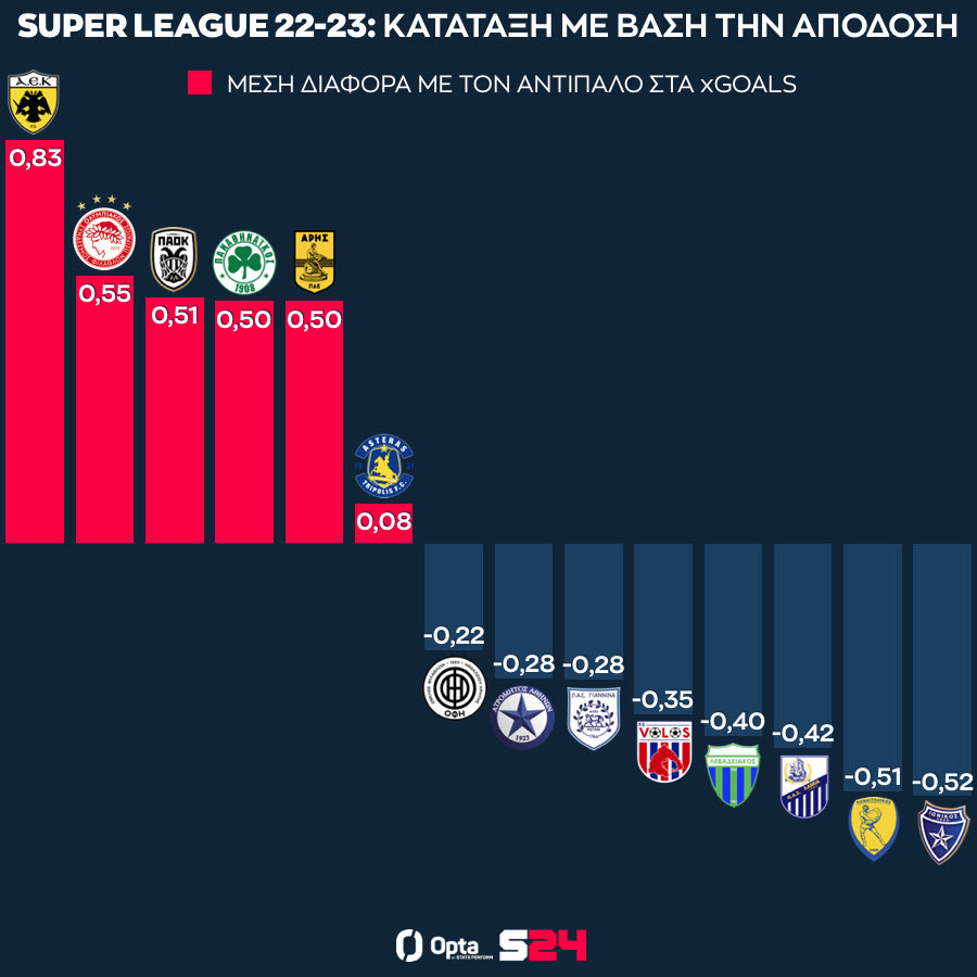 Ο Παναθηναϊκός μπορεί να ήταν στο +8, αλλά στο χορτάρι η ΑΕΚ ήταν αυτή που ήταν καλύτερη, με 0.67 xGoalsDifference, μπροστά από το 0.58 της ομάδας του Γιοβάνοβιτς, με Ολυμπιακό, Άρη και ΠΑΟΚ να ακολουθούν.